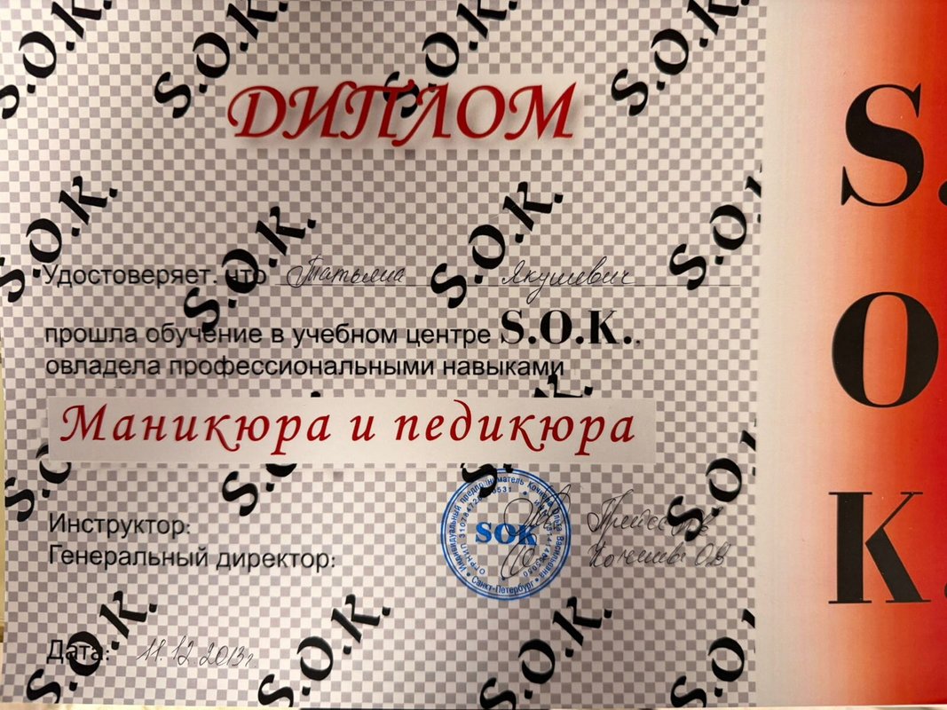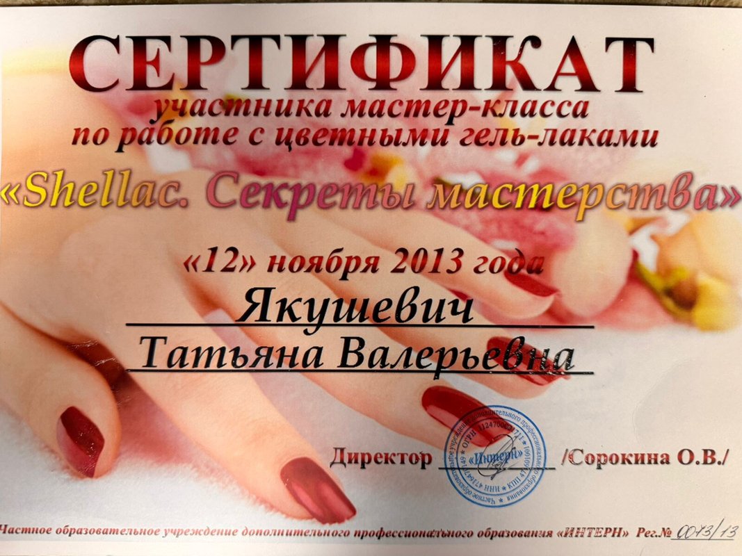 Якушевич Татьяна как бьюти-специалист сделает все возможное, чтобы вы стали ее частым клиентом. Она предлагает такие услуги, как аппаратный, мужской, французский, японский маникюр, аппаратный, комбинированный педикюр, массаж рук и парафинотерапия.
